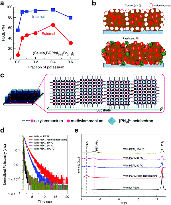 (a) 碘化钾钝化钙钛矿薄膜的PLQE随钾离子含量变化;