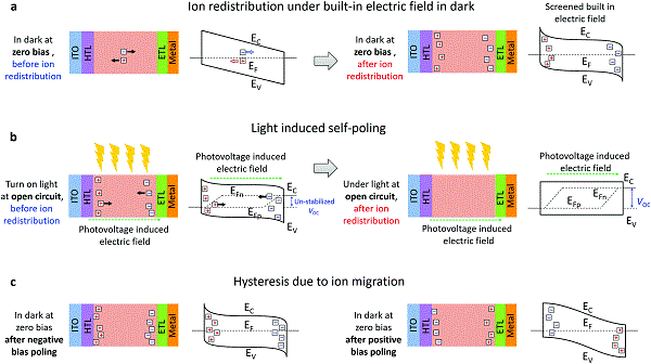 (c) 反向偏压下,碘离子迁移至电子传输层,在界面处累积;