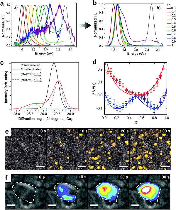 (a, b) MAPb(BrxI1-x)3薄膜光照前后的归一化PL光谱;