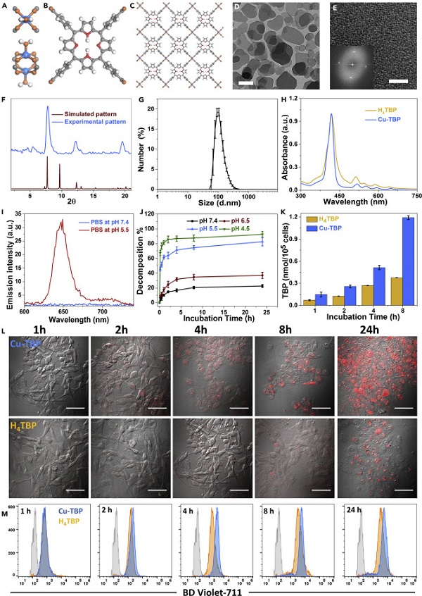 (J)通过游离H4TBP的UV-vis吸收定量分析不同pH下Cu-TBP的分解情况;