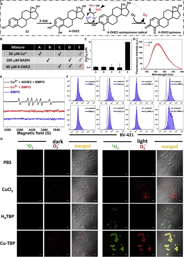众所周知,肿瘤可以逃避免疫监视,通过调节信号通路紊乱、劫持免疫抑制细胞和细胞因子、耗竭效应细胞(T细胞)和分子,从而避免被免疫系统消除。阻断程序性细胞死亡蛋白-1(PD-1)及其与配体(PD-L1)等免疫抑制途径,可以恢复全身性抗肿瘤免疫,使得被批准的几种抗PD-1和抗PD-L1抗体作为治疗癌症患者的有效方法。然而,单独靶向PD-1和PD-L1的CBI不能在非免疫原性肿瘤患者中引起足够的反应。目前,常用的光动力疗法(PDT)和化学动力疗法(CDT)等自由基疗法利用肿瘤微环境(TME)中的外部刺激或内源性触发产生的活性自由基(ROS)来杀死肿瘤细胞。但是TME中存在的还原性物质、缺氧环境以及内源性H2O2不足,都降低了ROS杀肿瘤细胞的效果。因此,需要开发新策略来克服这些不利因素以增强自由基疗法的疗效。研究发现高表达的血清雌二醇(E2),一种主要的雌激素,与癌症风险增加有关。E2主要与雌激素受体ERα和ERβ结合,其表达水平直接影响细胞增殖,细胞周期停滞,最终影响肿瘤发生。已有研究证明通过在生物可利用的Cu2+离子催化雌激素会产生ROS,进而与DNA形成稳定的加合物。因此,将自由基疗法和癌症免疫治疗相结合,有望克服彼此之间的缺点,以达到更好的治疗效果。