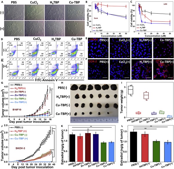 (A)没有或有光照下,利用PBS、CuCl2、H4TBP或Cu-TBP处理的B16F10细胞的光学图;