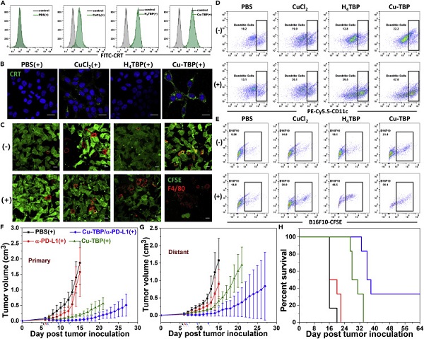 (F, G)用PBS、α-PD-L1、Cu-TBP或Cu-TBP加上α-PD-L1处理的B16F10荷瘤小鼠的平均开始和远处肿瘤生长曲线;