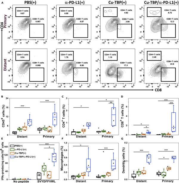 (B-G)用PBS、α-PD-L1、Cu-TBP或Cu-TBP加α-PD-L1处理的肿瘤浸润(B)CD45+细胞、(C)CD4+T细胞、(D)CD8+T细胞、(F)巨噬细胞和(G)树突细胞占总肿瘤的百分比;(E)10 μg/mL SVYDFFVWL肽刺激42 h后测定荷瘤小鼠脾脏细胞内能生成IFN-γT细胞的比例。