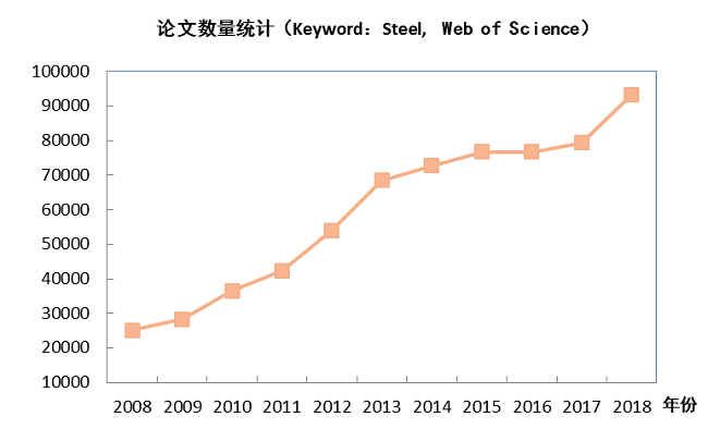 钢铁是黑色金属领域中的基本结构材料,有“工业的骨骼”之称。首先,在Web of Science平台以“Steel”为关键词检索了2008-2018年以来的论文数量统计情况,结果如图1所示。我们发现,自2008年以来钢铁领域的研究论文数量呈现出稳步上升的态势,特别是在2012年进入快速发展阶段,接着在2013-2017年期间数量变化较为平稳,年论文量维持在80000左右,约为2008年的4倍,最后在2018年以后又出现了快速增长。