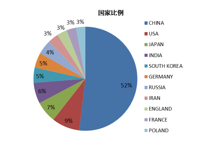 从图5、6看到,目前国内外在钛合金方面的研究保持着良好的发展势头,从2008年开始,在研究成果数量方面保持着30%-40%的年增长率。在过去十年的检索总量方面,我国居首,接着依次为俄国、美国、印度和日本等其它国家。