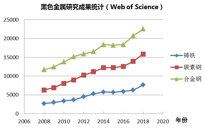 接着,分别以carbon Steel、alloy steel、cast iron为关键词进行了检索,结果如图3所示。观察发现:(a)三个领域在2008-2018年期间整体表现出逐年增长的趋势,其中以合金钢和碳素钢的增长最为明显;(b)在2014年-2016年期间,三个领域均处于平缓发展阶段,接着到2018年又出现了较大的增长。