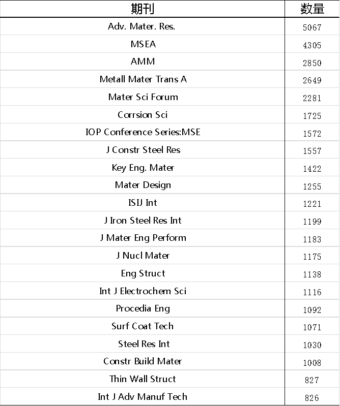 图4为一些检索刊文数量比较靠前的期刊。可以看出,黑色金属领域的研究已经侧重于工业生产和实际应用,而理论方面主要集中在腐蚀、电性、磁性等物理和化学方向。