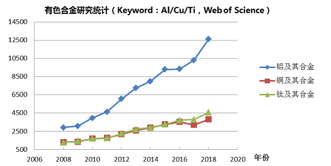 从图5(Date:2019/6/19)可以看出,铝合金类的研究在2009年开始进入快速增长阶段,研究成果数量从2008年的2500增加到2018年的12500,在十年期间内的增幅接近5倍之多,且增势无缓减之意。
