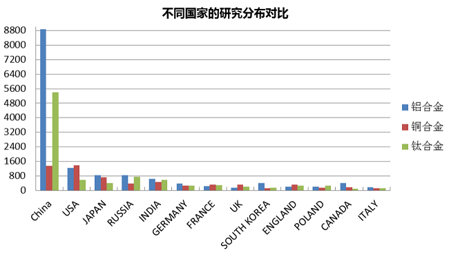 从图5、6可以看出,铜及其钛合金类的研究相对铝合金类的研究成果数量较少,在2008年-2018年期间的研究成果数量增幅不是很明显,仅为1倍左右,而且与铝合金类的研究成果数量差距呈现出逐年增加的趋势。在铜合金研究成果数量方面,以美国为首,我国次之,日本、印度和俄国紧随其后。