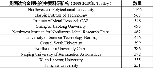图7为Web of Science上检索到的我国钛合金领域的主要科研机构及其科研成果数量(检索词:Ti/Titanium alloy,检索时间:2019/7/1)。可以看出,我国超过一半以上的研究机构为高校和科研院所,如西北工业大学、哈尔滨工业大学、金属所、上海交通大学、西北有色金属研究院、北京HTH官网地址 大学等,而企业自主研究方面的成果则相对较少。国内钛合金布局相对集中,主要分布在华东、西北及东北片区。
