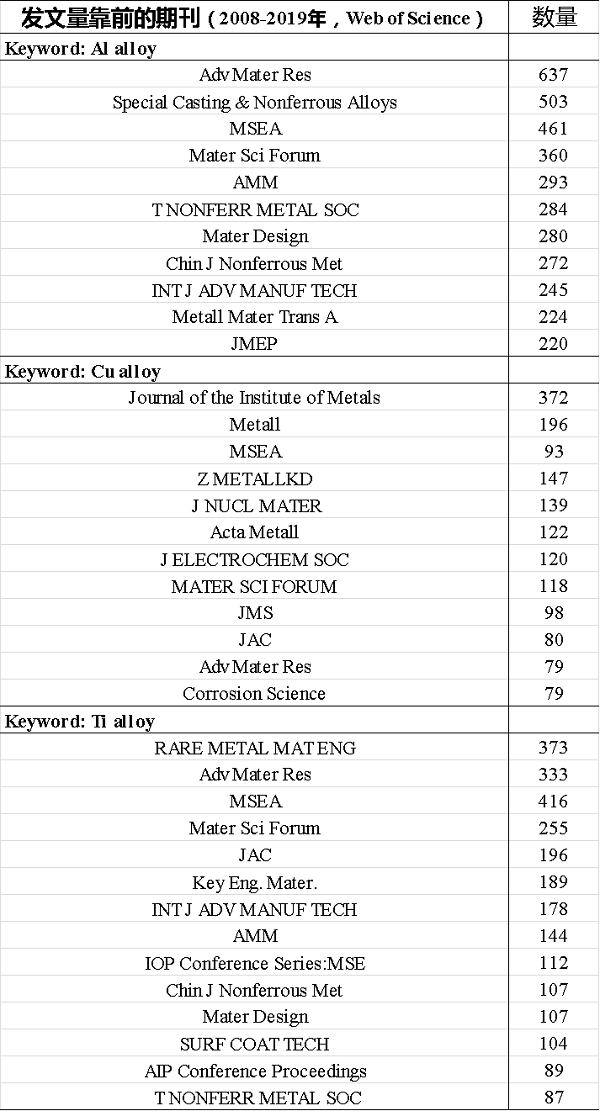 图8汇总了以Al/Cu/Ti alloy为关键词检索得到的2008 -2019年期间发文量靠前的一些期刊(Date:2019/6/19),其中,Adv Mater Res、Journal of Institute of Metals、RMME分别以637/372/373排在最前。对SCI分区期刊的影响影子统计发现,MSEA、JAC、Materials & Design、Acta等是有色金属领域比较受欢迎和青睐的几个期刊。其次,稀有金属材料与工程、金属学报、有色金属学报、特种铸造及有色合金等国内期刊在过去几年也刊载了较大数量的关于Al、Cu、Ti的合金组织、作用机制和加工工艺方面的论文成果。
