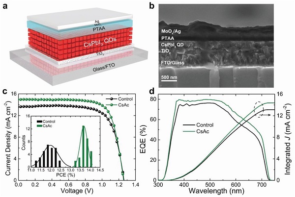 图一、CsPbI3量子点太阳能电池的结构和性能表征