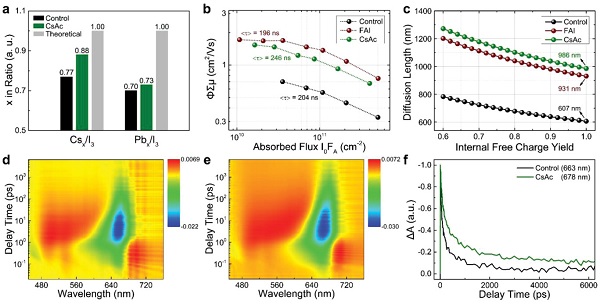 (d-f)(d)对照组、(e)CsAc处理的薄膜、(f)在特定波长下的对照和CsAc处理的薄膜的TAS延迟。