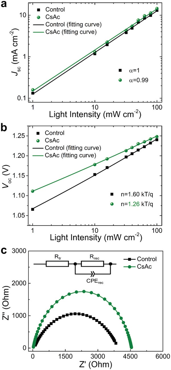 图四、利用JSC和VOC来研究CsPbI3量子点器件中的复合过程