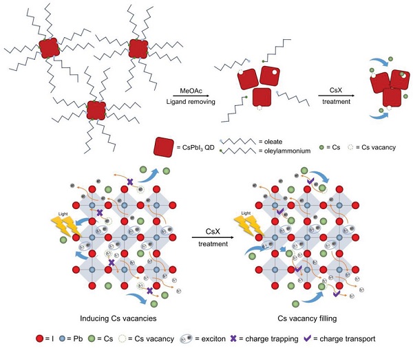图五、CsPbI3 量子点薄膜沉积和CsX后处理过程以及配体去除和Cs盐后处理后的内部激子生成、电荷捕获和传输过程的示意图