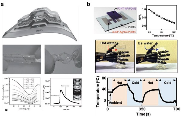 a)透明和可拉伸门控温度传感器(顶部)的示意图,机械变形下的装置的光学图像(中间),在不同温度(底部,左侧)测量的装置的传递特性,以及传感器对热水的电流响应 (下,右)