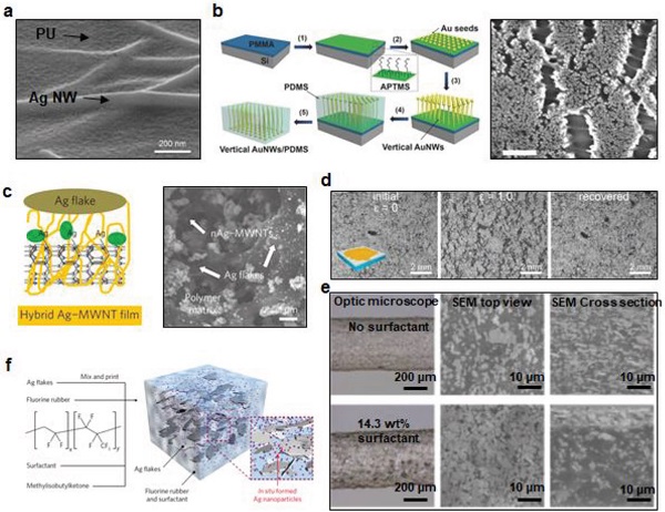 e)具有和不具有表面活性剂的微米级Ag薄片基橡胶状导体的光学显微镜和SEM图像