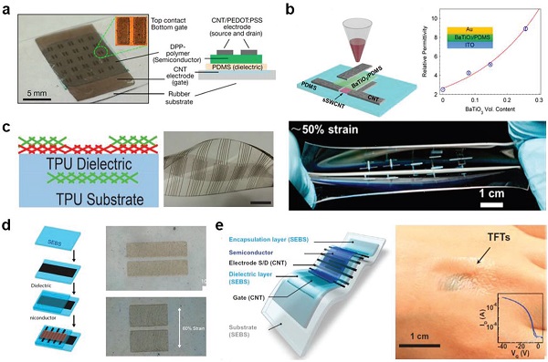 a)完全可拉伸的5×5有机晶体管阵列(左)的照片和具有PDMS电介质的单个晶体管的结构(右)