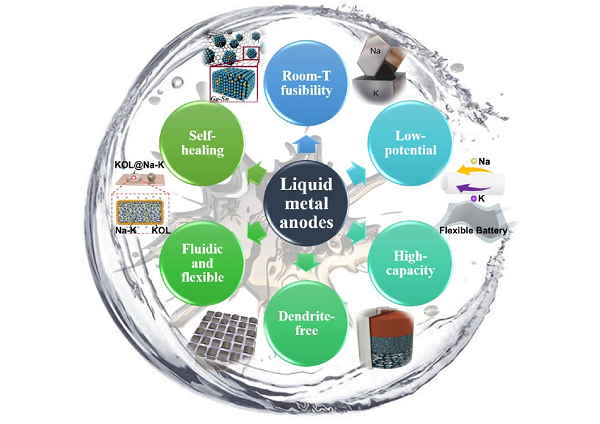 液态金属和合金体系具有本征的形变能力、高电导率和优异的电化学性质,因此受到了诸多研究者的关注,特别地,在储能相关研究领域尤为明显。与现有的碱金属离子电池相比,液态金属有与固态金属负极相媲美的低电位和高容量密度,却可以避免绝大多数金属或合金电极所存在的支晶生长问题。与需要严格的温度管理、成熟的电池密封工艺的高温液态金属体系比较,室温液态金属可以在无外加能量输入的情况下保持液态的优势特征,使其在先进储能技术领域崭露头角。