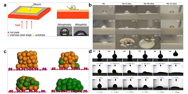 (b)钠的润湿行为和不同温度下钠合金在β-Al2O3固态电解质基底表面的情况;
