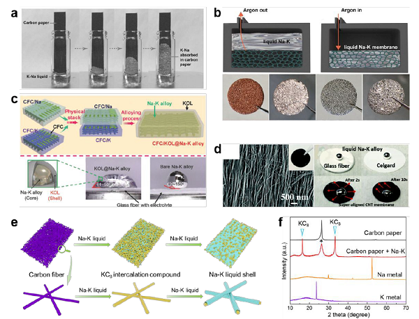 (c)电池中室温Na-K阳极的示意图,表现出无支晶生长特点和形貌自我修复能力 – 对于固态Na或K金属来说,严重的枝晶生长会穿透隔膜,引起内部短路;