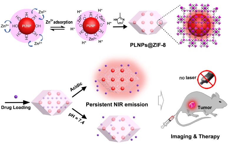 图1. 长余辉发光金属有机骨架(PLNPs@ZIF-8)的合成并用于肿瘤位点激活成像和药物释放的示意图。