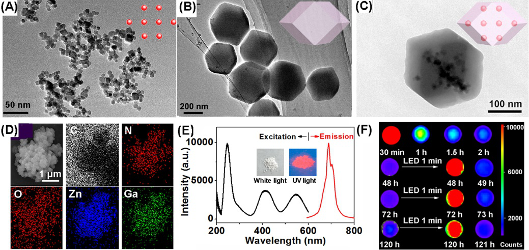 近期,天津大学化工学院仰大勇教授课题组合成了一种具有超长余辉发光的发光金属有机骨架材料,实现了肿瘤位点激活的余辉成像和药物输送。该材料无需实时激发即可发出700 nm的近红外余辉,并可持续数小时甚至数天,发光时间远远超过传统的发光材料,克服了传统发光材料背景干扰严重,发光寿命短的缺点。在弱酸性条件下(肿瘤位点),该材料的余辉发光明显增强,显示出独特的肿瘤位点选择性发光成像。同时,该发光金属有机骨架材料具有丰富的有机无机作用位点和超高的比表面积,可以高效负载药物,并对酸性环境具有特异性响应,实现药物在肿瘤部位的选择性药物递送。该长余辉发光金属有机骨架提供了一种具有良好应用前景的低背景成像和药物递送载体。