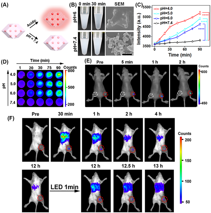 图3. 长余辉发光金属有机骨架的酸响应性发光及肿瘤成像。红圈为正常肿瘤,白圈为中和后的肿瘤。
