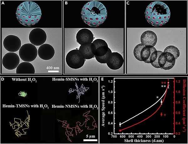 (D)具有代表性的跟踪轨迹表明,不同壳厚的Hemin-MSNs的扩散增强;
