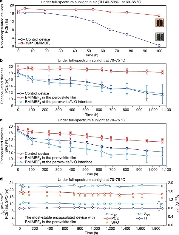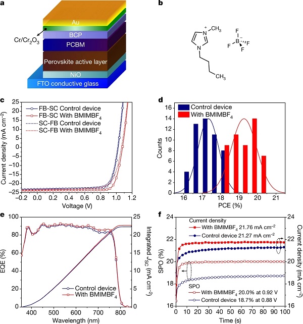 文献链接:Planar perovskite solar cells with long-term stability using ionic liquid additives (Nature, 2019, DOI: 10.1038/s41586-019-1357-2)