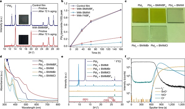图三、薄膜稳定性与含有PbI2和BMIM-离子液体的相互作用