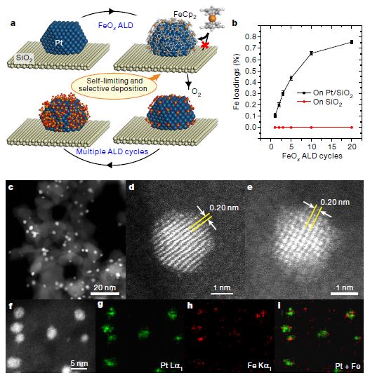 中国科学技术大学的路军岭教授、杨金龙教授以及韦世强教授(共同通讯作者)等团队密切合作,利用原子层沉积技术,设计了一种新型Fe1(OH)x-Pt单位点的界面催化剂,该催化剂在低温环境中能够高效去除氢气中的微量CO。研究人员利用原子层沉积中的表面自限制作用,结合二茂铁金属在贵金属表面解离吸附和分子间空间位阻效应的特性,在SiO2负载的Pt金属纳米颗粒表面上精准构筑出单位点的Fe1(OH)x-Pt界面催化活性中心。这一活性中心不仅丰富存在,而且表现出超高活性和稳定性。研究人员利用该新型催化剂首次在~-75 °C至110 °C的超宽温度区间实现了100%选择性地CO完全去除,突破了现有催化剂工作温度相对较高以及区间较窄的问题。这一新型催化材料为氢燃料电池在低温条件运行期间,避免一氧化碳中毒提供了一种高效保护措施,从而为未来氢燃料电池汽车的推广扫清了一重大障碍。