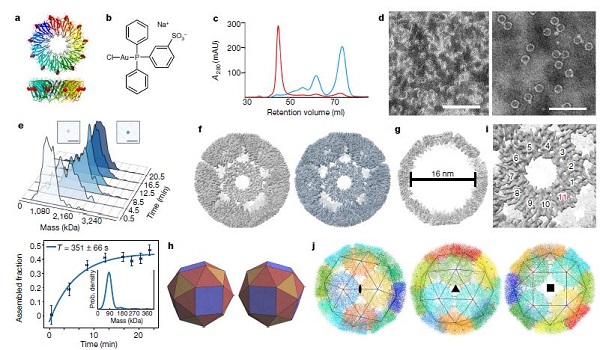 对称蛋白质笼在自然界中经过进化发展,可以胜任多种角色,包括物质递送等。不仅如此,这类材料还启发着合成生物学家,为精确操控蛋白质-蛋白质界面以创造新型蛋白质组装体提供着源源不断的思路。尽管实验室制备蛋白质笼的研究还在不断取得突破,但是设计蛋白质诱导组装体依然是一个难点。日本大阪大学的J. G. Heddle(通讯作者)团队报道了可利用蛋白质-蛋白质界面上的金属配位来控制组装-解组装的人工蛋白质笼。研究人员将金-三苯基膦化合物加入到半胱氨酸取代的蛋白质环中,并触发了该蛋白质的超分子自组装,产生了分子量超过2MDa的单分散笼状结构。这一蛋白质笼展现出优异的化学和热稳定性,然而同时还能在还原性环境中轻易地进行解组装行为。研究人员还发现,不仅是金,水银也能促使这种蛋白质笼生成。这一工作为将蛋白质组装成具有高等级结构材料提供了新的思路。