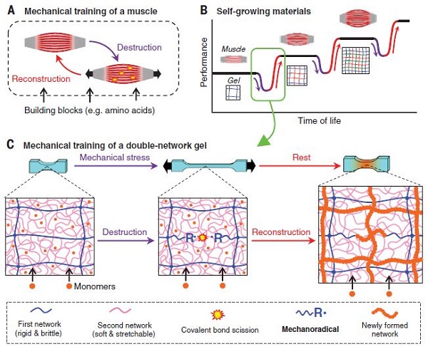 受肌肉训练的启发,日本北海道大学的龚剑萍和Tasuku Nakajima(共同通讯作者)等人提出可以通过机械化学转变来发展“自生长”聚合物材料的策略。机械力破坏聚合物链可以产生机械自由基,因此可以利用该种自由基进行高效的聚合重组。为了获得足够的机械自由基,研究人员以PNaAMPS和聚丙烯酰胺(PAAm)构建了双网络凝胶材料。这种凝胶可以提供大量的单体,反复的载荷对凝胶聚合物链产生破坏,生成机械自由基,这些自由基与凝胶中单体进行聚合反应,达到重组结构的作用,展现出“自生长”的现象。研究人员认为,这一工作为发展智能的凝胶材料提供了新的机会。