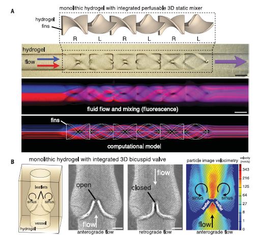 器官间用于传输液体的血管网络交错复杂,构筑了精细且尚未研究透彻的三维传输系统。人工构建类似的仿生系统不仅能够加深对生物系统的认知,还具有巨大的应用前景。然而,由于其复杂程度,这类功能化拓扑结构的体外设计和制备是一项非常巨大的挑战。利用可光聚合物的水凝胶材料,华盛顿大学的J. S. Miller和莱斯大学的K. R. Stevens(共同通讯作者)等人合作设计了具有多血管网络的人工系统。研究人员以食物添加剂染料作为光刻的光吸收材料,可快速制备单片透明的水凝胶,并在水凝胶中集成了三维液体混合器以及功能化瓣膜。利用空间填充拓扑学,研究人员在水凝胶中精细制作了交错的血管网络,研究了人红细胞的氧合作用以及流动现象。这一人工设计还被用于研究肝损伤模型,为其应用发展奠定了基础。