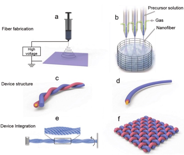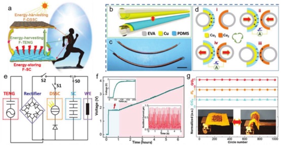 a) 纤维状的自供电系统方案;