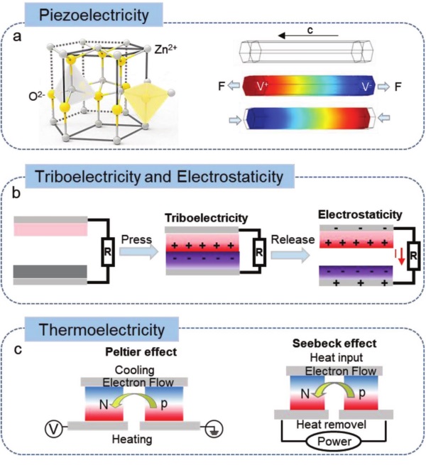 图3 压电效应、摩擦起电、静电效应和热电效应机制