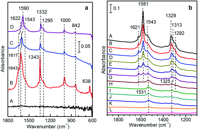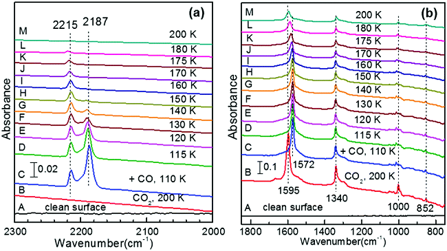 实际催化过程中,往往并不是单一吸附物种在催化剂表面吸附,而是多种吸附物同时存在于催化剂表面。Noei等人在超高真空条件下(UHV-FTIRS),通过FTIR光谱研究了CO与不同改性的多晶ZnO的相互作用。在110K下将干净的无吸附质的ZnO纳米颗粒暴露于CO后,在2187cm-1处有强烈振动带,是CO与ZnO上的Zn2+位点结合所致。在210K下将CO2预处理后的ZnO纳米颗粒暴露于CO后,在2215cm-1处观察到新的CO振动带,是吸附在三齿碳酸盐结构内的游离Zn位点上的CO所致。不同温度下记录的UHV-FTIRS数据表明,在预吸附的CO2时,CO在多晶ZnO上的结合能显着增加,而且在ZnO粉末颗粒上存在的羟基物质不会导致在UHV条件下CO振动带的显著变化