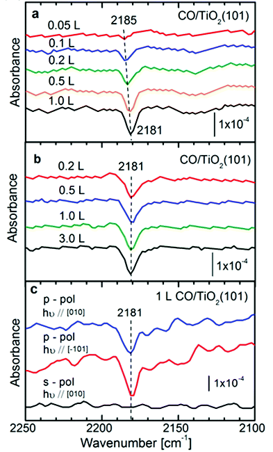 Setvin等人用红外反射吸收光谱(IRRAS)结合程序升温脱附(TPD),扫描隧道显微镜(STM)和DFT理论计算等研究了一氧化碳在锐钛矿TiO2(101)晶面的吸附。IRRAS谱图显示在2181cm-1处仅有一个CO带,结合TPD,估计分离的分子的吸附能量为0.37±0.03eV,在较高的覆盖率下,吸收峰移动到略小的值。又结合STM成像和样品的受控退火证实了TPD估算的吸附能和轻微的排斥分子间相互作用。CO分子在稍高的温度下从富电子的外在供体缺陷位点解吸,与金红石TiO2(110)表面上的CO吸附的比较表明,锐钛矿型TiO2中电子定域的趋势比金红石TiO2中弱得多。