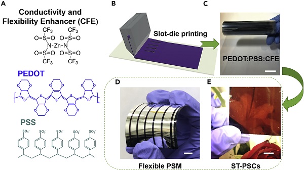 在本文中,研究人员报道了一种导电性能优异且稳定的PEDOT:PSS:CFE电极,在槽模印刷过程中,在离子添加剂和溶液剪切的辅助下,获得了理想的导电聚合物网络结构,皆具良好的透光度、较好的机械耐受度,大幅提高了柔性钙钛矿太阳能电池的光电转换效率和力学稳定性,使大尺寸柔性钙钛矿太阳能电池应用于可穿戴设备变得更加可行,也为研发新一代可穿戴电子设备提供了新的思路和方法。