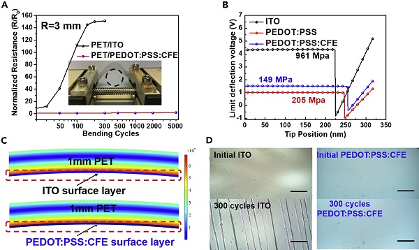 (c) 基于PET/ITO和PET/PEDOT:PSS:CFE电极的应力有限元模拟;