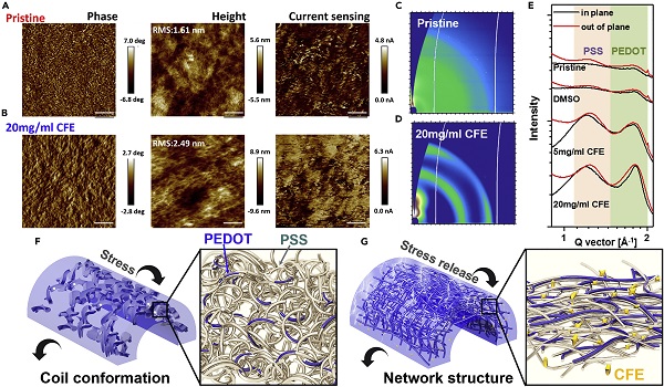 (f-g) PEDOT:PSS和PEDOT:PSS:CFE薄膜构象示意图。