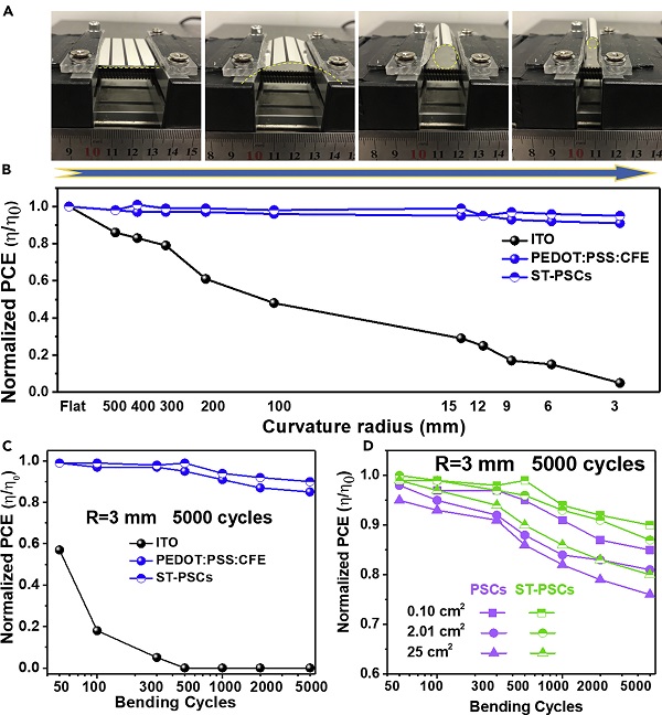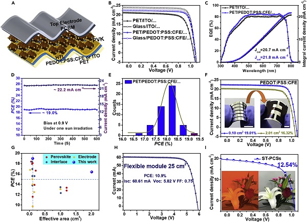 近日,中科院化学所宋延林研究员、南昌大学陈义旺教授和西安交通大学马伟教授(共同通讯作者)等人利用氟表面活性掺杂剂来调节导电聚合物网络的相分离,开发了一种PEDOT:PSS:CFE电极来提高柔性钙钛矿电池的效率和力学稳定性。这种新型的电极材料设计,解决了当前主流的柔性电极PET/ITO弯折性能差的难题,并皆具优异的导电性和良好的透光率。基于此电极制备得到的0.1cm2和25cm2面积的柔性钙钛矿电池光电转换效率分别为19.0%和10.9%。该电极在半透明钙钛矿电池中也具有很好的应用前景,在30.6%的平均可见光透过率下,其稳态效率可达12.5%。在曲率半径为3 mm的5000次弯曲循环之后,0.1cm2、25 cm2和半透明器件效率分别保持85%、80%和90%的初始效率,具备优异的耐弯折性能,是柔性钙钛矿电池领域的重要突破,为研发新一代可穿戴电子设备提供了新的思路和方法。相关成果以题为“A Mechanically Robust Conducting Polymer Network Electrode for Efficient Flexible Perovskite Solar Cells”发表在Joule上。