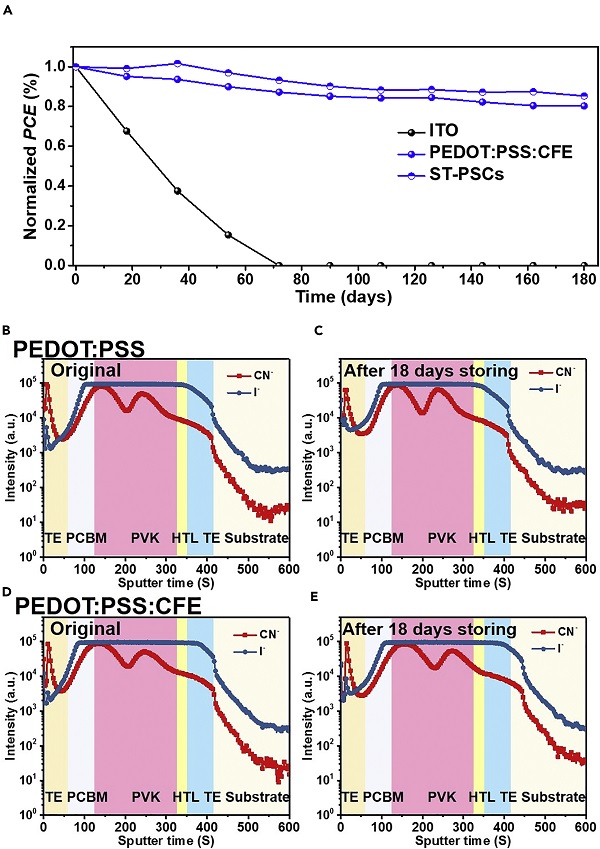 (d, f) 基于PEDOT:PSS:CFE电极的钙钛矿器件ToF-SIMS元素深度谱。