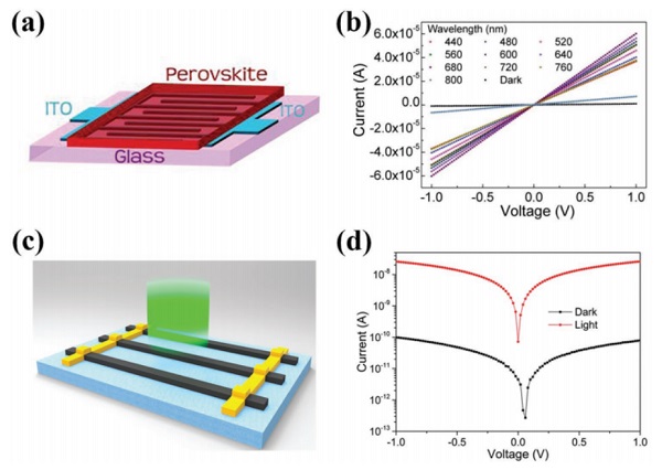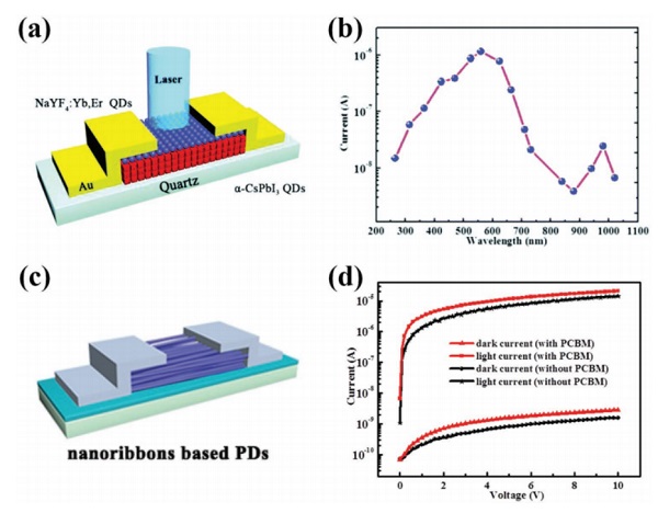 光探测器的器件性能主要取决于活性材料和器件结构。可分散的无机材料极大地简化了薄膜的制备,同时保持了良好的导电性;有机小分子材料和聚合物材料具有较宽的波长响应,特别是在可见光区域,并且可以通过改变官能团对其性能进行调节;有机-无机杂化材料体系也是一个很有前途的发展方向,其兼具了良好的电学和光学性能;钙钛矿材料以其优异的光电性能正在成为一个新的研究方向。此外,具有一定微结构(包括纳米颗粒,纳米线,纳米片等)的活性材料也被广泛研究,得益于其特有的性能(例如量子尺寸效应和各向异性等),这些材料在器件中有着广泛的应用。除了对活性材料的发掘,改变器件结构也是一种提高性能的有效方法。共混、双层和多层结构有助于提高器件的响应度,扩展探测范围和加快反应速度。