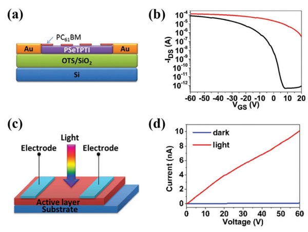 (a,c)基于PCBM与PSeTPTI结合的有机器件的示意图