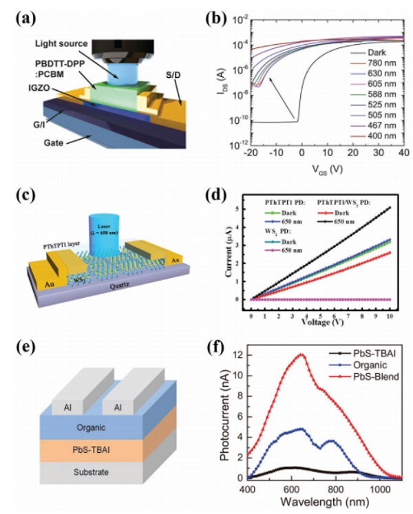Figure 6.基于各种有机材料的器件示意图和性能表征