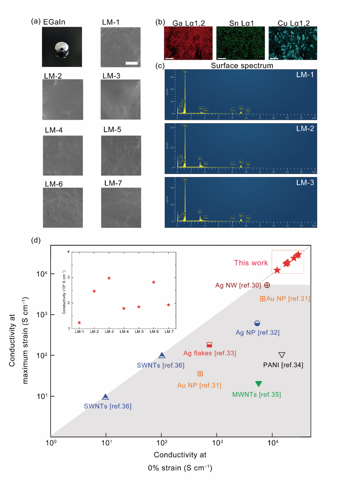(a) 纯EGaIn和改性后的七种液态金属形貌(分别命名为LM-1~LM-7);
