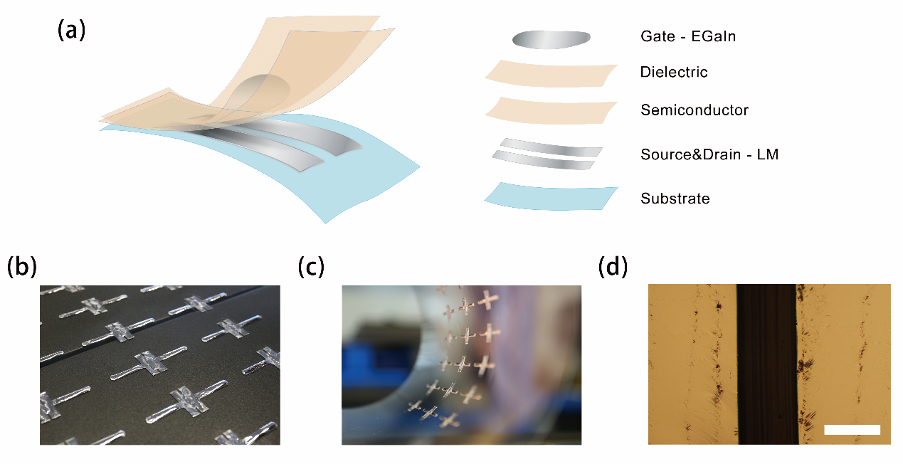近年来引发国际广泛重视的液态金属印刷电子学为此提供了诸多可能,新型功能材料-液态金属是在常温常压下保持液态的一类合金,具有许多常规材料不易拥有的独特属性,蕴藏着诸多以往从未被认识的新奇物理特性。当前围绕室温液态金属的基础及应用研究已成为国际热门的重大HTH官网地址 前沿,正为电子信息、高新能源、先进制造、国防军事以及生物医疗健康技术等领域的发展带来颠覆性变革,并开辟出多个十分重要的新兴方向。液态金属具有优异的导电性及稳定性,相应电子器件可以直接打印并应用于各种非常规及柔性基板上,不仅克服了传统电子器件制作工艺复杂、成本昂贵、要求苛刻、缺乏柔性等弊端,而且能有效发挥柔性器件可弯曲、拉伸、折叠,且轻量化、大面积、个性化、低成本制造电子器件等方面的优势。因此液态金属电子器件被认为是柔性全打印集成电路的最有前途及巨大潜力的候选者,必将引领和推进柔性功能器件领域的重大进展。然而,要发展真正基于液态金属的高性能柔性印刷集成电路,首先应在柔性基板上实现基于液态金属与半导体相结合的薄膜晶体管(TFT)单元器件。